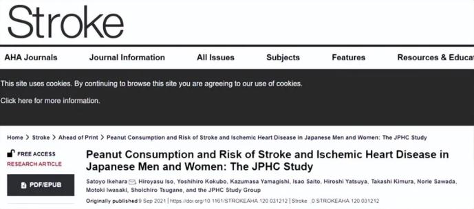 具体来看,相较于花生摄入量最低组,最高组脑卒中发病率下降了16%、缺血性脑卒中发病率下降了20%、心血管发病率下降了13%。且不论男女、无论男女,都发现了这样的关联。